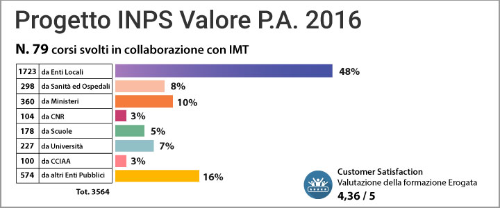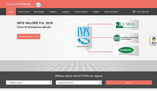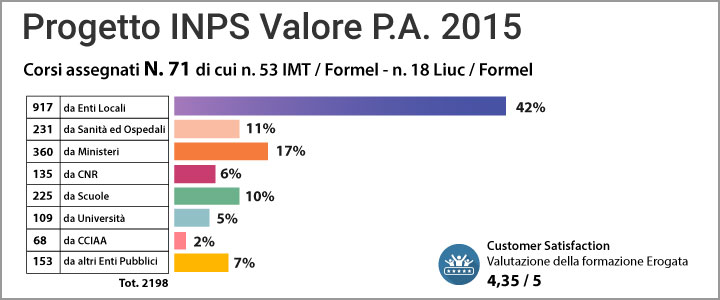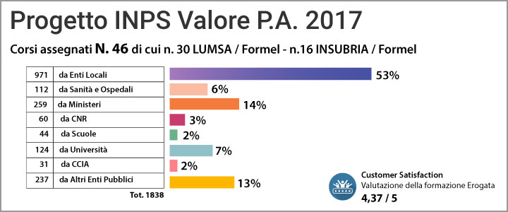 >>> Dal 2015 in poi, relativamente al PROGRAMMA VALORE P.A. proposto annualmente da INPS, Formel in collaborazione con prestigiose Università Pubbliche e Private (IMT Alti Studi Lucca, Università Carlo Cattaneo LIUC, LUMSA - Libera Università Maria Ss Assunta di Roma, Università degli Studi dell'Insubria di Varese a Como) ha presentato le proprie proposte di accreditamento presso tutte le Direzioni Regionali INPS. Grazie alla solida organizzazione interna, ha gestito tutte le fasi previste dagli Avvisi INPS, ottenendo l’attivazione della maggior parte dei corsi selezionati inerenti tutte le tematiche di interesse per la formazione dei dipendenti pubblici. Più di 2014 Pubbliche Amministrazioni hanno aderito ai corsi Formel Valore P.A. e circa 12510 dipendenti hanno partecipato alla formazione erogata, esprimendo giudizi favorevoli e positivi su tutti gli aspetti, sia organizzativi sia in rapporto all’estrema professionalità dei docenti coinvolti.