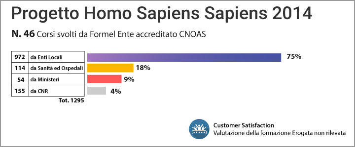 >>> Nel 2014, come Agenzia accreditata CNOAS per la formazione continua Assistenti Sociali, Formel ha aderito al PROGETTO HOMO SAPIENS SAPIENS erogando circa 250 giornate formative rivolte a più di circa 1.200 Assistenti Sociali dipendenti pubblici.